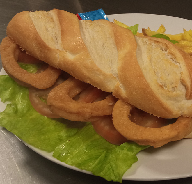Calamares, Tomate en rodajas, Lechuga, Alioli o Mahonesa
