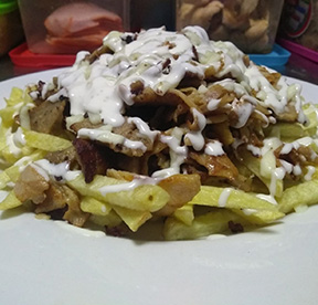 Patatas fritas, Carne de Kebab pollo o Ternera, Mozzarela y Salsa Yogurt