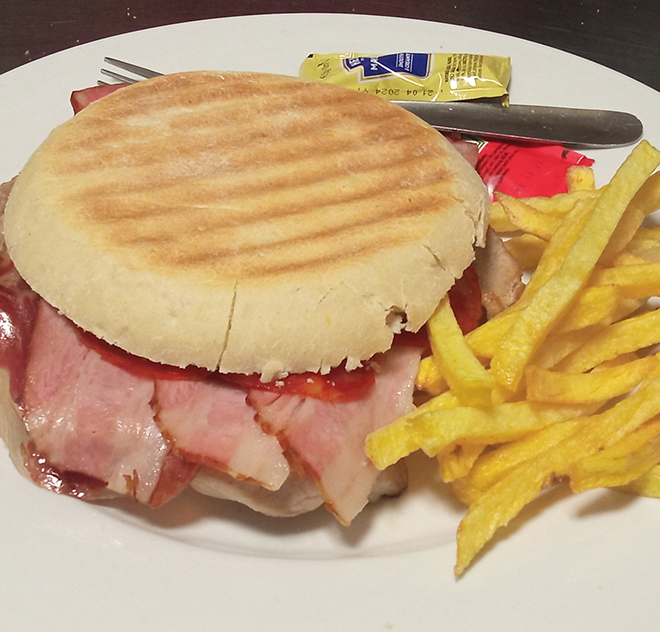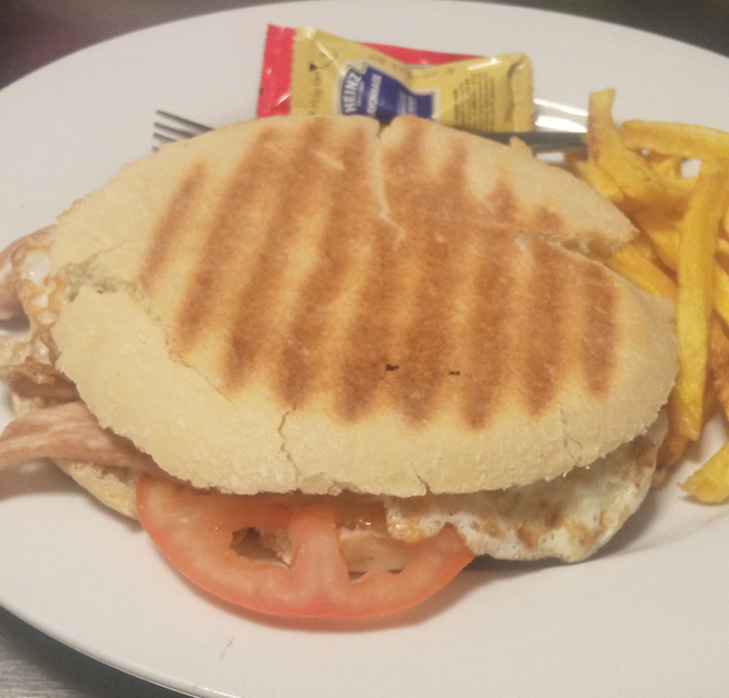 Tomate en rodajas, Filetes de pollo o cerdo, Huevo frito, Salsa Mahonesa, Salsa Gaucha y Lechuga